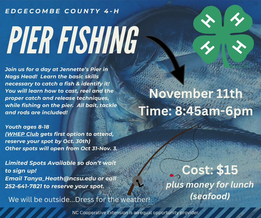 Join us for a day at Jennette’s Pier in Nags Head! Learn the basic skills necessary to catch a fish and identify it! You will learn how to cast, reel and the proper catch and release techniques while fishing on the pier. All bait, tackle and rods are included!Youth ages 8–18