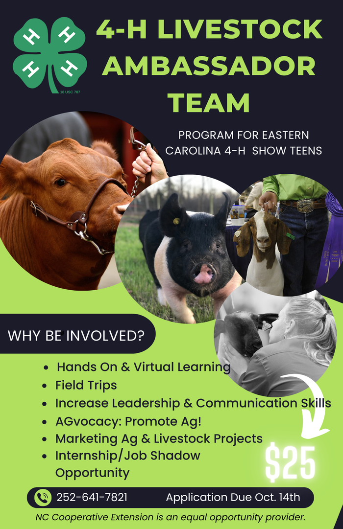 This program is designed for teens involved in the Eastern Carolina 4-H Livestock Show & Sale. Teens (ages 14-18) as of Jan. 1, 2024 will have a unique opportunity to learn both hands-on and virtual; take field trips, increase their leadership and communication skills, promote agriculture and even job shadow an agriculture expert in the area.